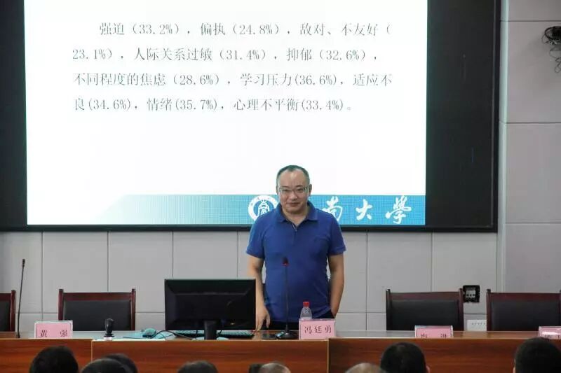 冯廷勇教授从学生常见心理问题、影响学生健康的因素、如何识别学生异常心理以及如何引导学生心理健康的沟通技巧、方式方法等方面,与江安中学的老师们进行了沟通交流。同时,冯教授也向老师们传授了缓解生活工作压力的技巧、应对职业倦怠的方法等。 据了解,江安中学留守儿童居多,这些孩子长期与父母分离,缺乏关爱,加之处在青春期,身体快速成长,心理变化剧烈,他们很容易在人际交往和学习生活中出现心理问题。 “我们了解和学习心理学的相关知识,首先对教师自己的身心健康发展有极大帮助,能更好地认识自己,平衡好生活与工作,做一个幸福的人。同时,我们能够更敏锐地发现和觉察学生的异常行为和心理状态,以便及时对困境生进行疏导,用足够的爱与智慧去帮助学生顺利走出青春期的迷茫,帮助他们健康成长,这是一件伟大又有意义的事。”副校长陈千全在活动结束时说,“对学生来说,老师的关切问候,一次家访,或者不经意地叮咛,极有可能是他们成长道路中最感动的瞬间,而恰恰是这些动人的瞬间,转化了困境生。”